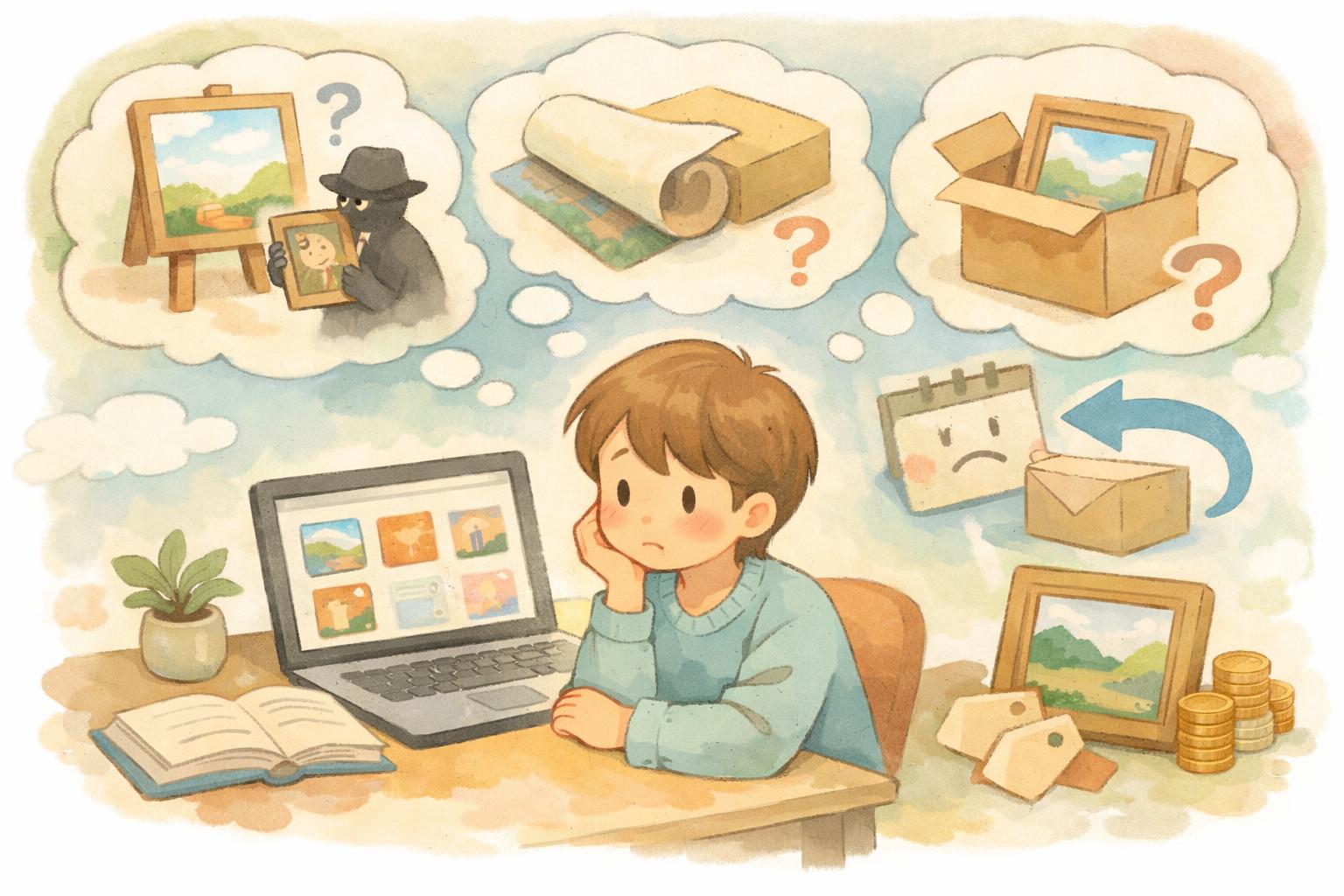 オンラインで絵画を購入する際は、実物を見ることができないという特性上、いくつか注意すべき点があります。後悔のないアートライフを送るために、以下のポイントを必ず確認しましょう。